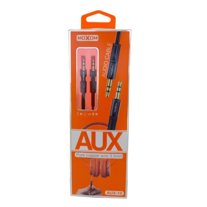 تظهر هذه الصورة عبوة كابل الصوت AUX-10 من Moxom. تتميز العبوة بتصميم بألوان البرتقالي والأبيض، مع تسليط الضوء على المواصفات الرئيسية للكابل، مثل توافقه مع مدخل 3.5 ملم وسلكه المصنوع من النحاس الخالص لتحسين جودة الصوت. كما تعرض العبوة صورة للكابل وموصلاته،